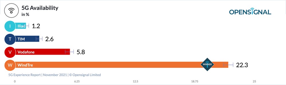 About him availability of the 5G signal, as anticipated, to make good and bad weather be WindTre: Operator customers stayed connected on 5G for 22.3% of the time against 5.8% of Vodafone users, the first of the “others”. Opensignal explains the significant difference to WindTre’s choice to rely on this 5G startup phase on Dynamic Spectrum Sharing (DSS) technology that enables “combine” the frequency spectrum 4G and 5G (1.8 + 2.6 + 3.7 GHz), while TIM, Vodafone and Iliad use the 3.7 GHz single band which offers higher speeds (and the difference will be seen in uploads and especially downloads) but also less coverage. The availability of the 700 MHz band (July 2022), which compared to the previous ones allows covering greater distances at the expense of the speed of the network.
